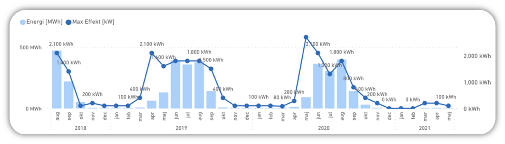 Max Power shows the peak hourly energy consumption in a month. It shows how evenly distributed the energy demand is across time, which can be used as input for peak shaving/load shifting strategies. Tracking the effects of implementing such strategies is also possible in Optimize.