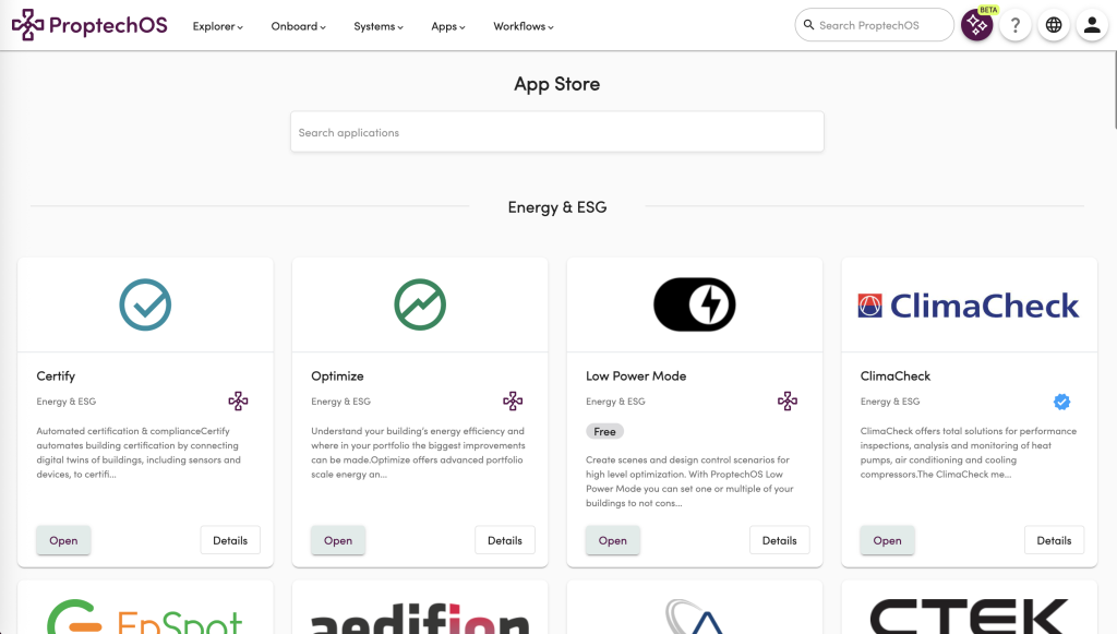 - Apps for sustainability, energy optimization, operations, and tenant experience.