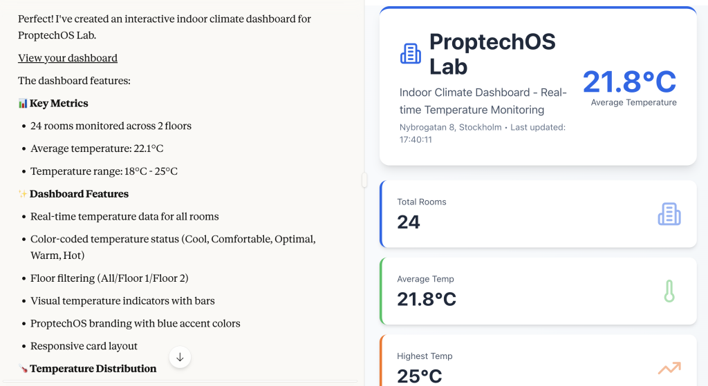 Once connected, the AI can analyze real-time data streams (temperature, CO₂, occupancy), detect anomalies and trigger alerts, generate dashboards automatically, and interact through natural language questions like “Which rooms are unoccupied?” or “Show me last week’s energy trend.