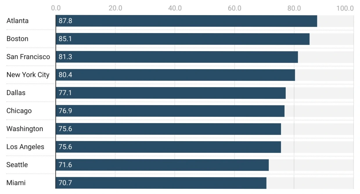 While Atlanta steals the top spot for its superior performance in the technology infrastructure and connectivity category, Boston is also performing well in this area for 2025.