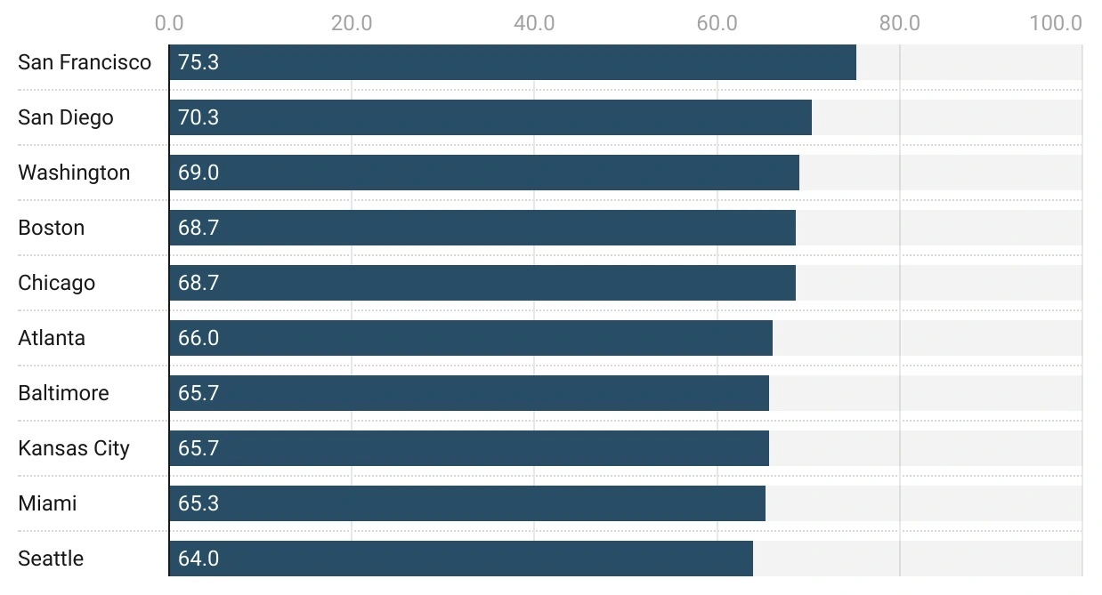 The following U.S. cities are the best prepared for a smart city future, scored out of 100 and based on 17 metrics related to tech infrastructure and connectivity, sustainability, and the tech job market.
