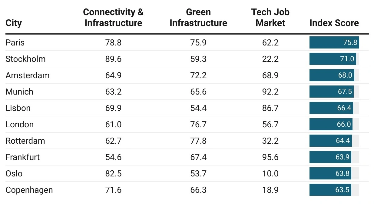 Within the tech infrastructure and connectivity category, Paris scores 79 out of 100, with only Stockholm and Oslo ranking higher. The French capital has the second-highest number of IoT companies (148) and the second-highest number of AI companies (666) headquartered there.