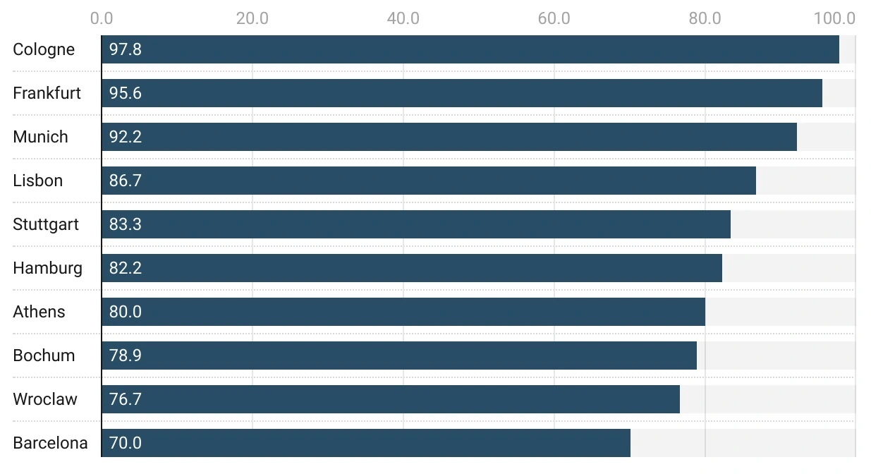 The Polish city of Wroclaw also enters this year’s top 10 ranking of tech job hubs in Europe. Its 91 tech jobs per 100,000 people are the eighth highest in Smart City Index 2025.