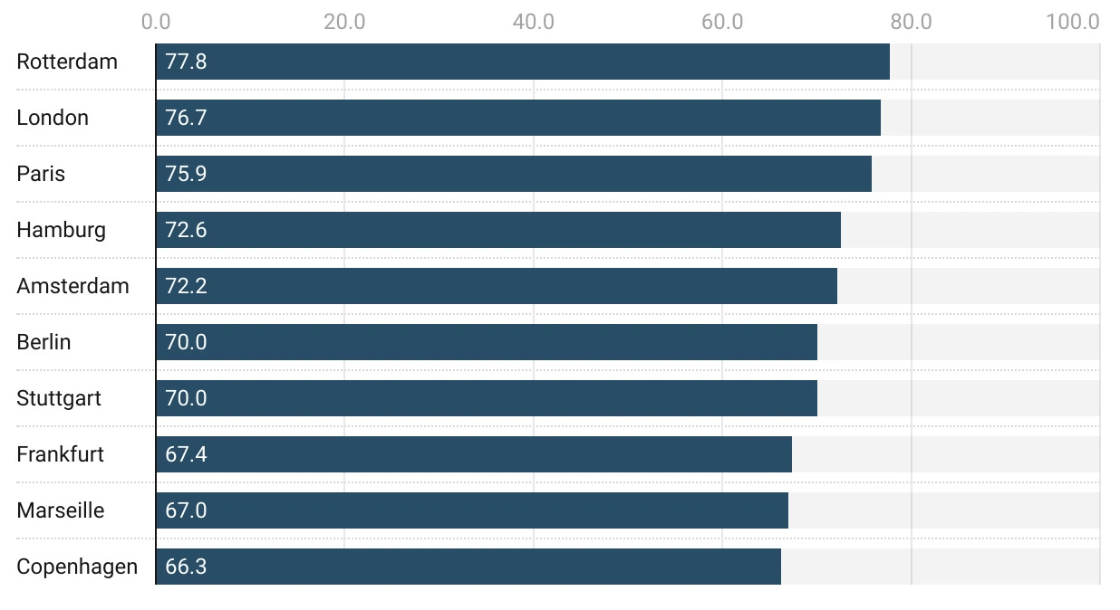 Ranking second behind Amsterdam on its rate of EV chargers per 100,000 people (73), it is also the fifth-best city for its level of air pollution. Its tree loss over more than two decades is the 11th lowest for any European city analysed — equivalent to 76 hectares – while it has created an additional 333 hectares of tree coverage over a similar period.