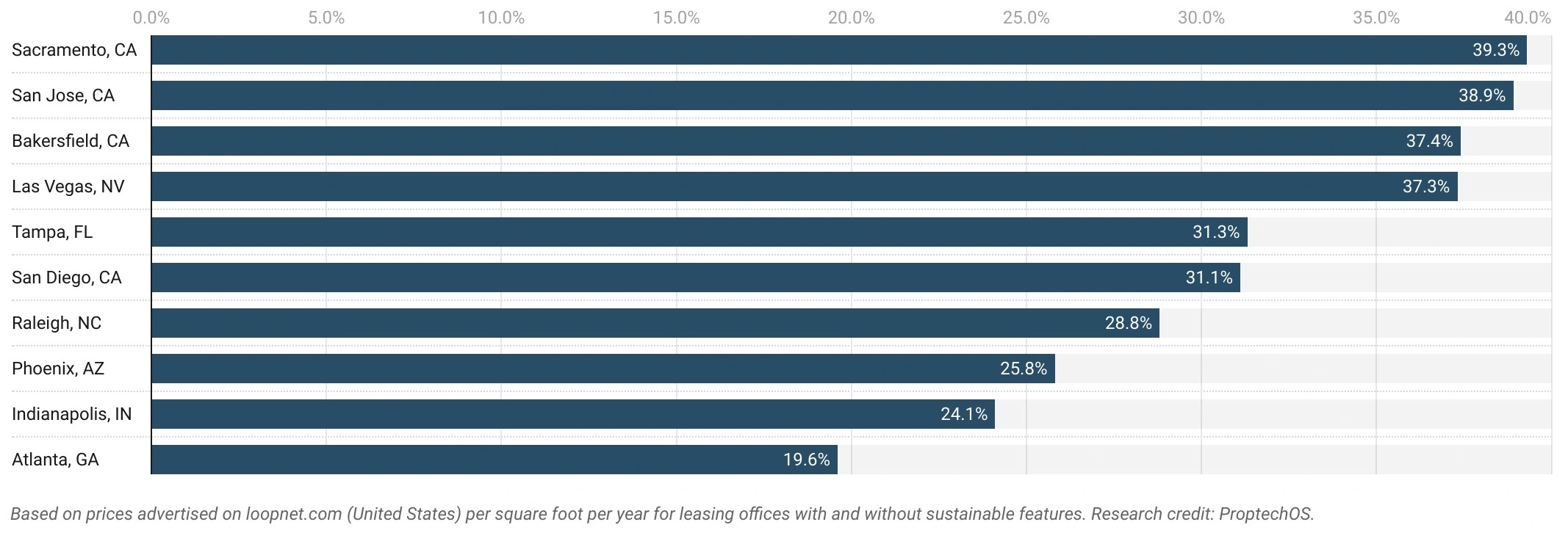 Sacramento, San Jose, and Bakersfield are the three most expensive cities to lease sustainable office space in the US when comparing their price premium to the local average price of non-sustainable office buildings.