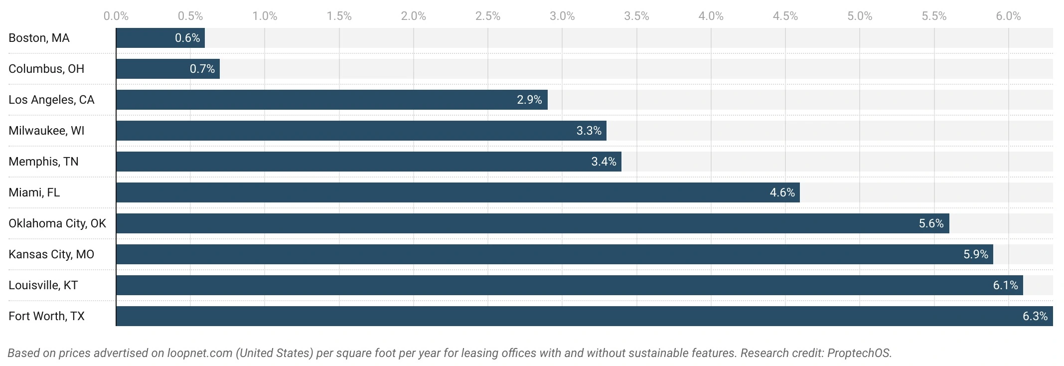 Business owners in Boston, Massachusetts pay the smallest premium to lease sustainable office spaces — on average they are priced as just 0.6% more than a non-sustainable office space.