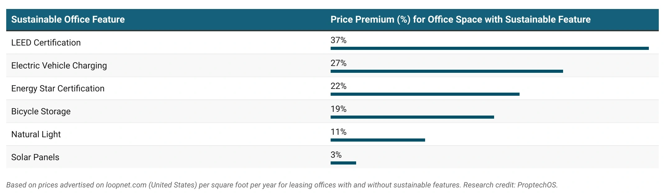 When we compare all of the office spaces in the United States, the most expensive sustainable asset for an office space is an LEED certification, which sees lease prices per square foot increase by an average of 37% compared to a standard office space.