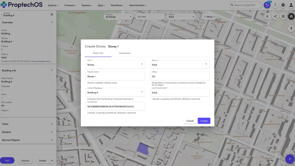 You’ll also need to fill in the coordinates for the Storey. The common format for local coordinates is 0 for latitude and longitude, but specified altitude which indicates the height of the Storey. Global coordinates are inherited from the building. We’ve pre-selected the coordinates for you, but feel free to adjust them as needed.